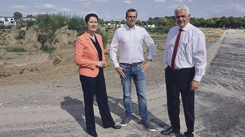 Die Landratskandidatin Silke Gorißen, der CDU-Bürgermeisterkandidat für Bedburg-Hau, Stephan Reinders, und der CDU-Kreisvorsitzende Dr. Günther Bergmann machten sich nun ein Bild vom Fortgang der Arbeiten im rund sieben Hektar großen Baugebiet „Ziegelhütte II“ im südöstlichen Teil von Hasselt. Tief-, Kanal- und fast alle Erdarbeiten sind dort bereits abgeschlossen und die Baustraßen gut zu erkennen.