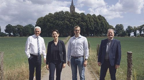 CDU-Kreisvorsitzender Dr. Günther Bergmann, CDU-Landratskandidatin Silke Gorißen, Bürgermeisterkandidat für Bedburg-Hau Stephan Reinders und Ortsvorsteher Jürgen Graven vor der Elisabethkirche in Louisendorf (v.l.n.r.).